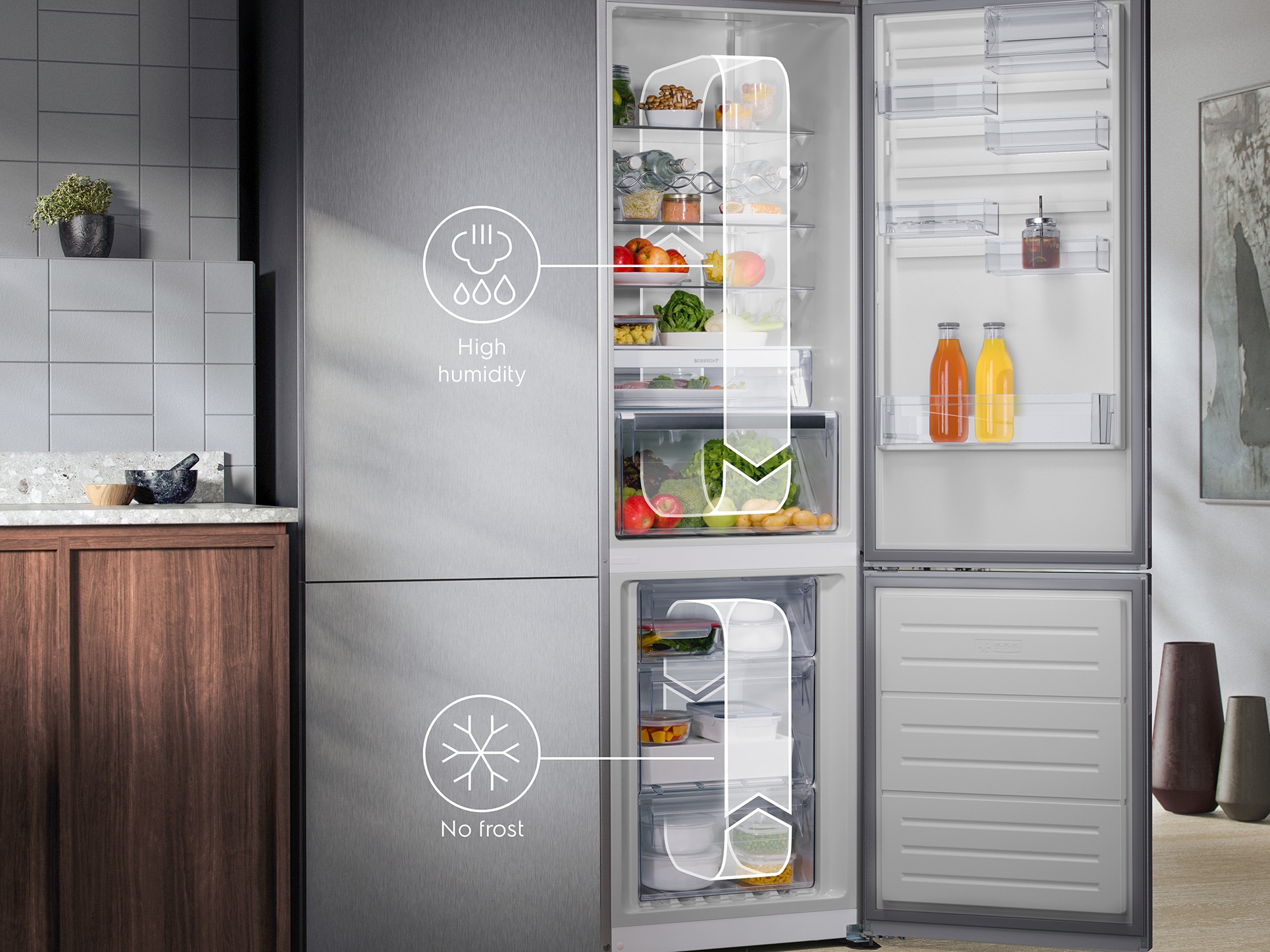Двойната охладителна система на хладилника с фризер TwinTech® No Frost 600 поддържа идеална влажност и предотвратява изсъхването на храната, като гарантира, че никога няма да се налага да размразявате фризера.