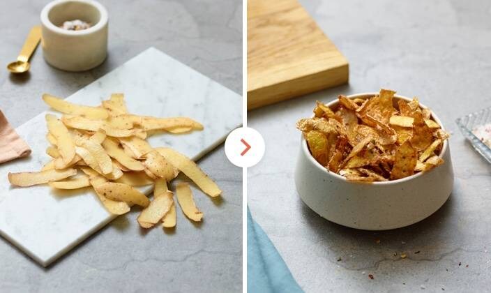 ![]() 1Чипс от картофени корички 1Чипс от картофени коричкиКартофените корички често се изхвърлят при готвене на картофи. Вместо това ги изпечете във фурната с капка зехтин и щипка сол. Почерпете гостите си с вкусно, хрупкаво предястие.