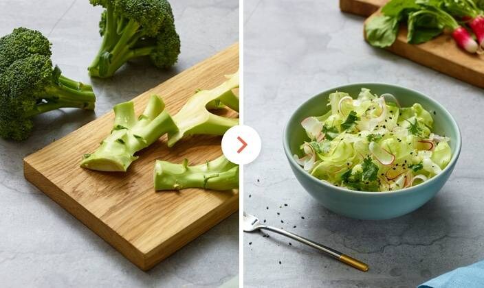 ![]() 3Салата от стъбла на броколи 3Салата от стъбла на броколиЗапазете стъблата! При броколите, обикновено стъблата са точно толкова хранителни, колкото и цветовете. Настържете стеблата с остър уред за белене на зеленчуци и ги смесете с Вашите любими съставки за салата.